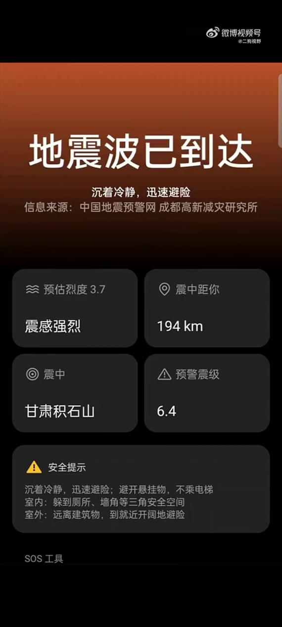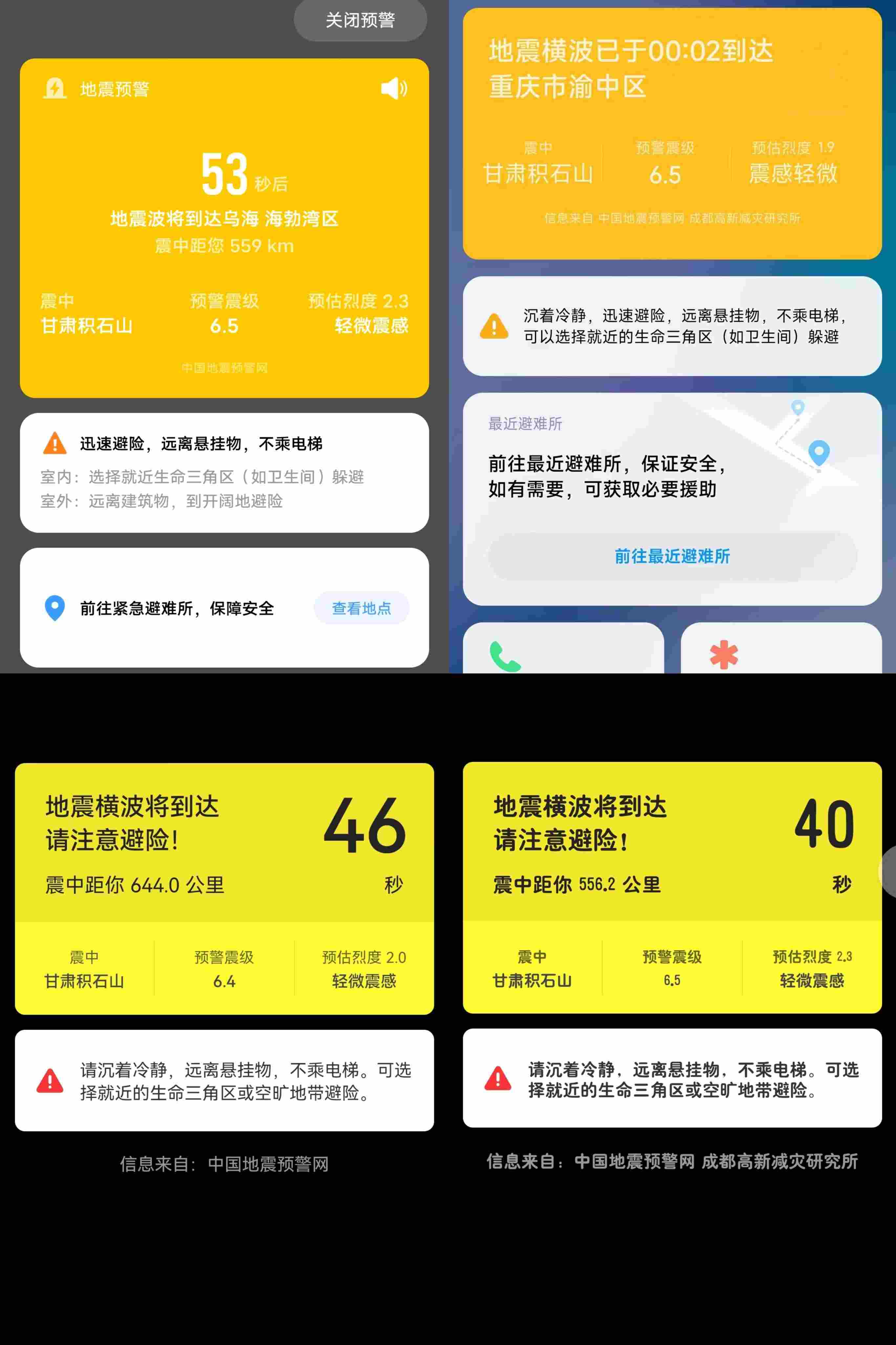 除甘肅地區(qū)外,很多周邊地區(qū)的居民也都及時(shí)收到了地震預(yù)警: