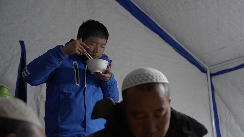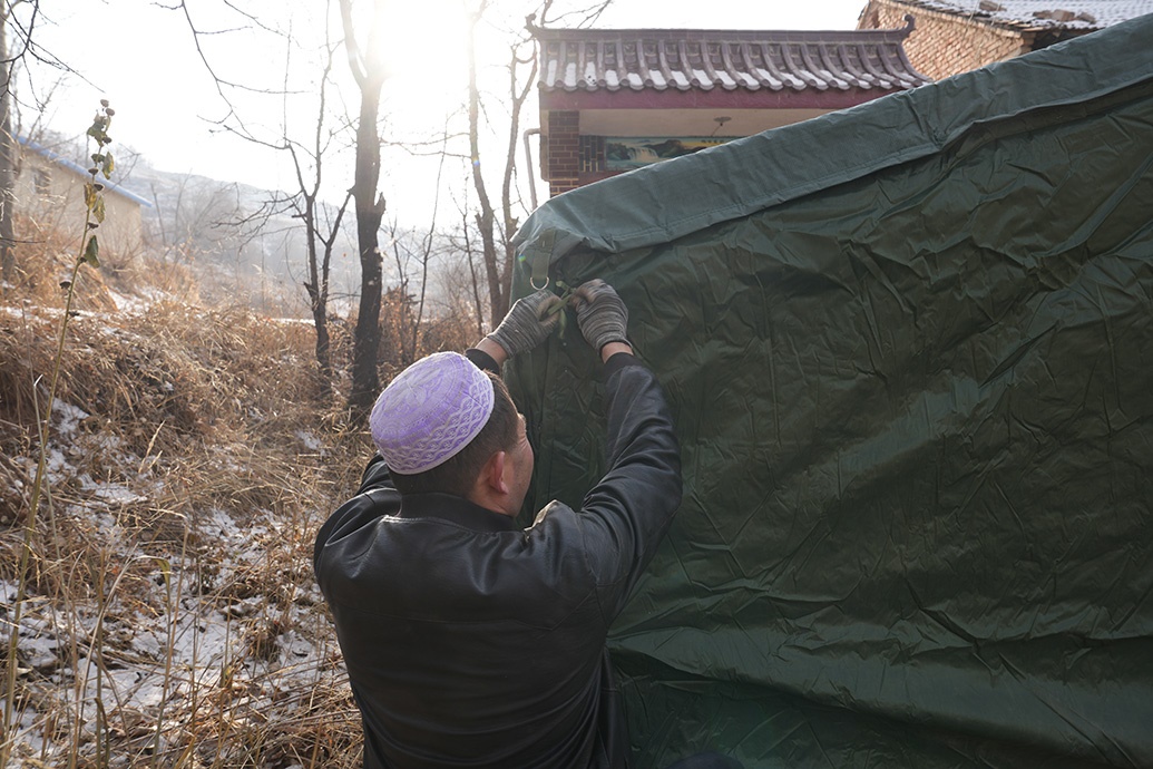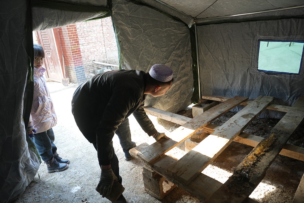 12月20日,馬國(guó)忠一家回到村里,拿塑料布在家附近搭了個(gè)簡(jiǎn)易帳篷,兩根木頭、一條橫梁支起來,怕煙筒把塑料烤化,帳篷里不能烤火,頂多防風(fēng),但馬國(guó)忠覺得比車?yán)飶?qiáng)多了。家里的電熱毯拿出來鋪上,他才睡了個(gè)安穩(wěn)覺。只是半夜來了余震,又醒了。他止不住想:下一步怎么辦?后面會(huì)不會(huì)繼續(xù)搖?他家鋼管焊的牛棚頂晃得“乒乒乓乓”響。