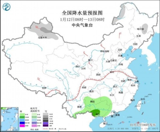全國降水量預(yù)報(bào)圖(1月12日08時(shí)-13日08時(shí))