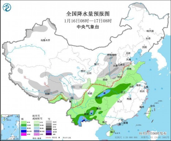 圖1 全國(guó)降水量預(yù)報(bào)圖(1月15日08時(shí)-16日08時(shí))