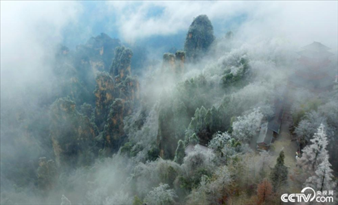 2024年1月20日,大寒節(jié)氣,張家界國家森林公園出現低溫冰雪天氣,天子山、袁家界、黃石寨一帶出現大面積霧凇冰掛景觀。