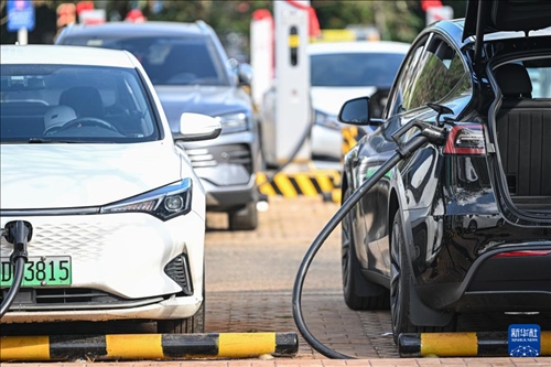 1月20日,新能源電動(dòng)汽車在位于海南省??谑械囊俪浜?谖捏w公園全液冷超充站充電。新華社記者 蒲曉旭 攝