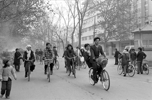 1990年春節(jié)期間,在陜西西安閻良區(qū),胸掛紅花的新郎用自行車馱著新娘經(jīng)過街頭。那個年代,用自行車接新娘曾經(jīng)一度成為流行的結(jié)婚方式。