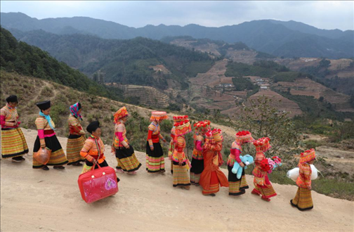 2017年2月21日,在四川省涼山彝族自治州德昌縣南山傈僳族鄉(xiāng)小南山村,新娘張小芳(右四)和送親隊伍帶著嫁妝向男方家走去。每年春節(jié)前后(農(nóng)歷臘月至次年二月)是當(dāng)?shù)乩圩迦伺e行婚禮的季節(jié)。