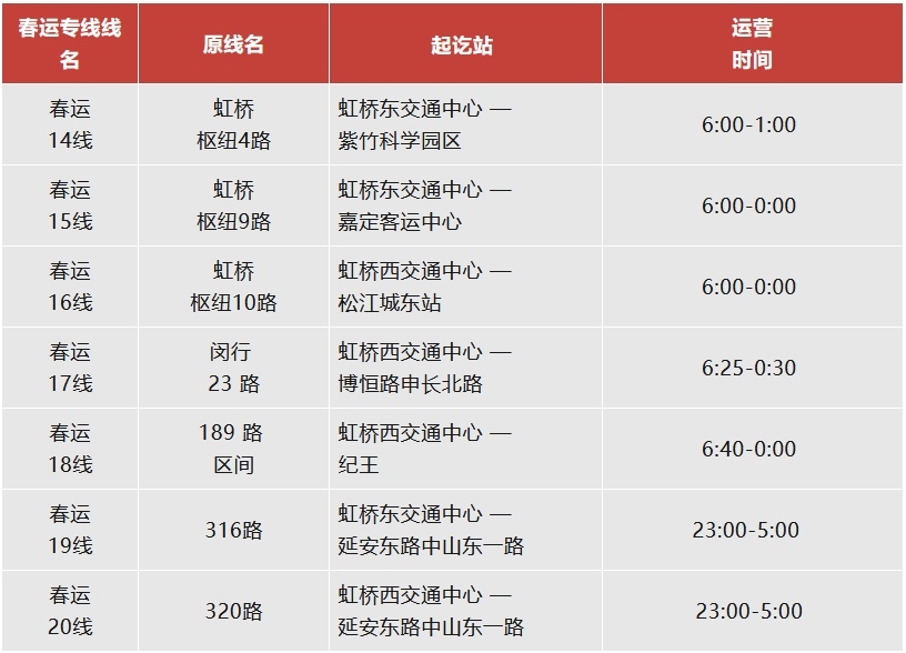 注:虹橋樞紐春運(yùn)專線運(yùn)營日期為2月14日至3月5日。