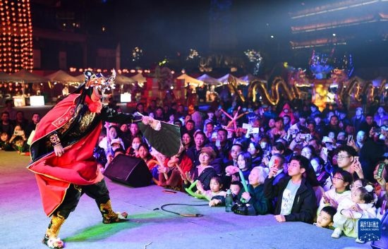 2月14日,市民和游客在重慶南濱路鐘樓廣場觀看川劇表演。