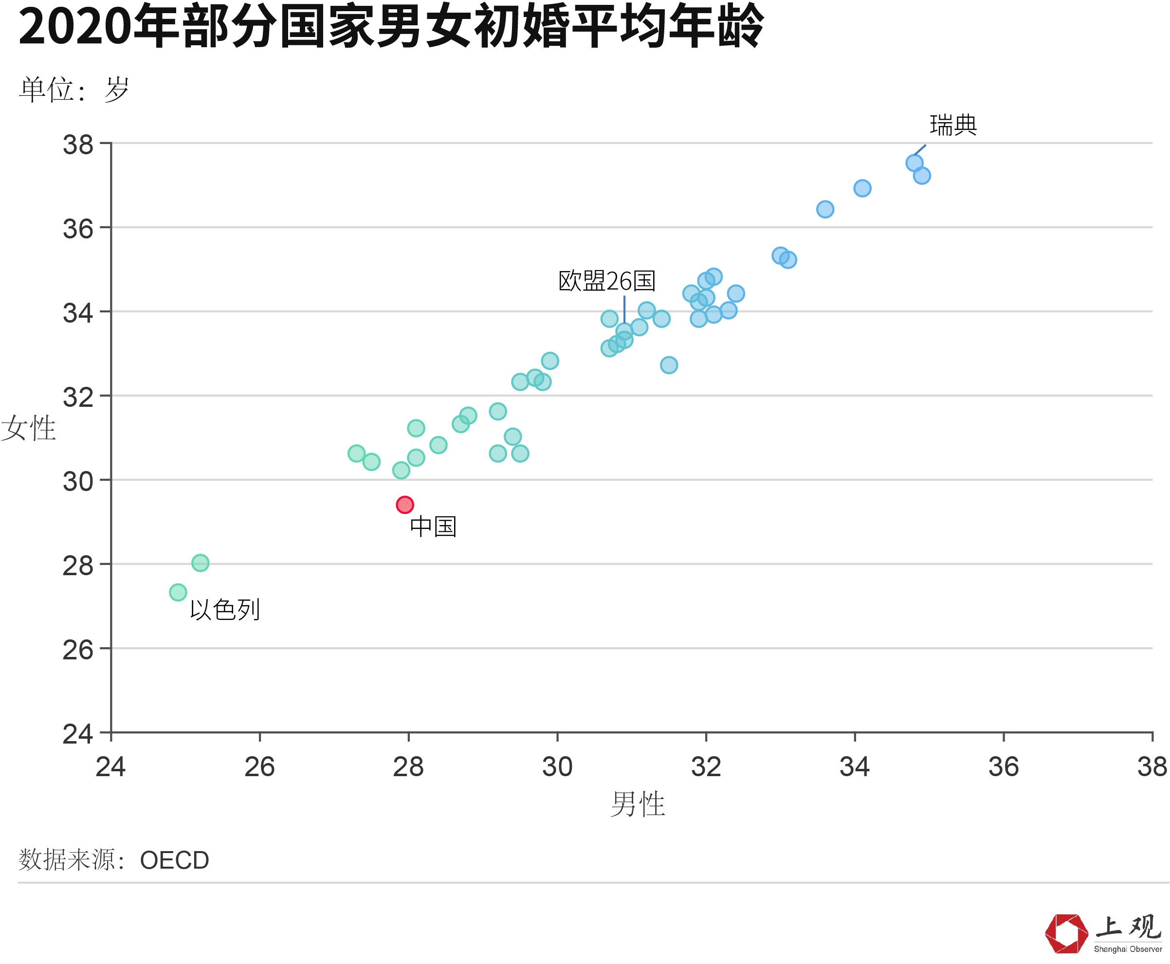 同時,經(jīng)濟越發(fā)達、結(jié)婚年齡也越晚。根據(jù)OECD的統(tǒng)計,在2020年,歐盟26國男性平均初婚年紀在33.8歲,女性為31.4歲。其中,瑞典是晚婚的極值,2020年男性平均初婚年紀已推遲到37.5歲,女性為34.8歲。