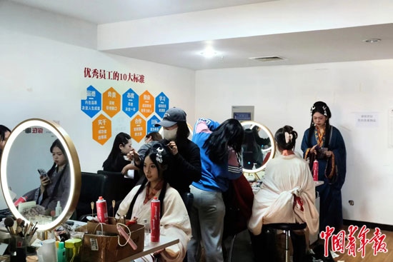 河北省邯鄲市叢臺公園附近一家旅拍館內,游客排隊體驗漢服妝造。焦晶嫻/攝