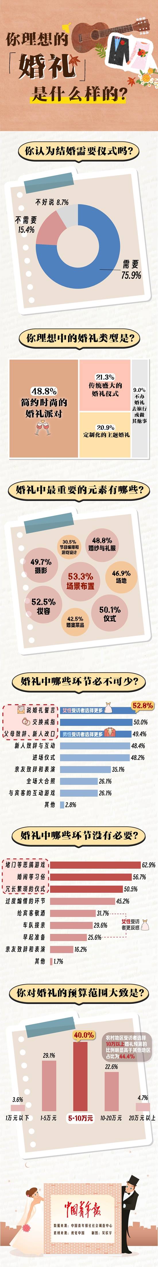 隨著年輕人逐漸掌握自己婚禮的話語權(quán),極簡婚禮正在一些年輕人中流行開來。調(diào)查顯示,48.8%的受訪青年表示自己理想中的婚禮類型是“簡約時尚的婚禮派對”,占比最高;僅有21.3%的受訪青年會堅持舉辦“傳統(tǒng)盛大的婚禮儀式”。