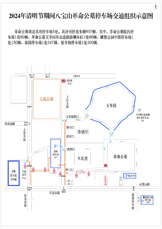 祭掃車輛可停放至公交停車場(chǎng)、老山南路路側(cè)停車場(chǎng)、雕塑公園西門停車場(chǎng)、原奧運(yùn)場(chǎng)站停車場(chǎng)。祭掃高峰日,上莊大街路側(cè)允許臨時(shí)停車。