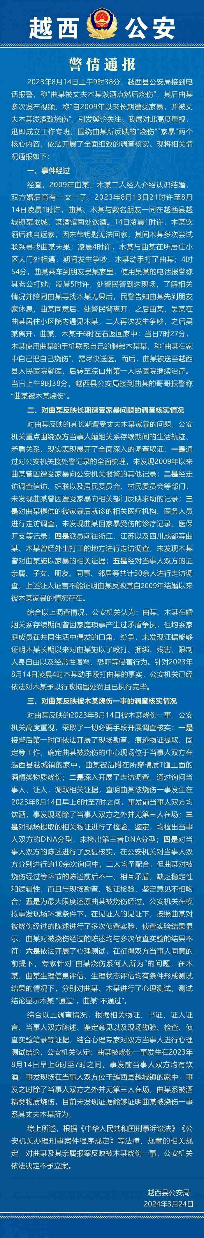 3月24日,越西縣公安局對(duì)此發(fā)布警情通報(bào)稱,綜合調(diào)查情況,根據(jù)相關(guān)物證、書證、證人證言、當(dāng)事人雙方陳述、鑒定意見以及現(xiàn)場(chǎng)勘驗(yàn)、檢查、偵查實(shí)驗(yàn)筆錄等證據(jù),結(jié)合心理專家對(duì)雙方當(dāng)事人進(jìn)行心理測(cè)試結(jié)論,公安機(jī)關(guān)認(rèn)定:曲某被燒傷一事發(fā)生在2023年8月14日早上6時(shí)至7時(shí)之間,事發(fā)前當(dāng)事人雙方均有飲酒,事發(fā)現(xiàn)場(chǎng)在當(dāng)事人雙方位于越西縣越城鎮(zhèn)的家中,事發(fā)之時(shí)除了當(dāng)事人雙方之外并無第三人在場(chǎng),曲某系被酒精類物質(zhì)燒傷,目前未發(fā)現(xiàn)證據(jù)能夠證明曲某被燒傷一事系其丈夫木某所為。警方表示,對(duì)曲某及其親屬報(bào)案反映被木某燒傷一事,公安機(jī)關(guān)依法決定不予立案。