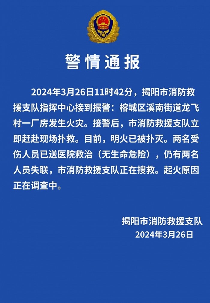 央視網(wǎng)消息:據(jù)“揭陽發(fā)布”微信公眾號消息,揭陽市消防救援支隊發(fā)布警情通報,2024年3月26日11時42分,揭陽市消防救援支隊指揮中心接到報警:榕城區(qū)溪南街道龍飛村一廠房發(fā)生火災(zāi)。接警后,市消防救援支隊立即趕赴現(xiàn)場撲救。目前,明火已被撲滅。兩名受傷人員已送醫(yī)院救治(無生命危險),仍有兩名人員失聯(lián),市消防救援支隊正在搜救。起火原因正在調(diào)查中。