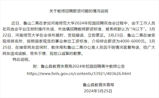 ·河南官方通報:高中教師招聘薪資1000以下系操作失誤。