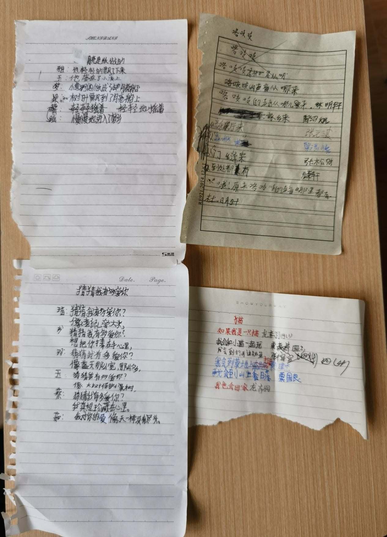 11歲的龍夢瑤是詩班里高產(chǎn)的一個。她在本子上擠擠挨挨寫一團字,一把撕下整頁,塞給李柏霖。這樣的紙片,李柏霖一天要收到幾十張。大大小小夾在書里,她晚上批改完,第二天再拿回學校,在課堂上分享。她估計,孩子們寫的詩已經(jīng)超過2000首。