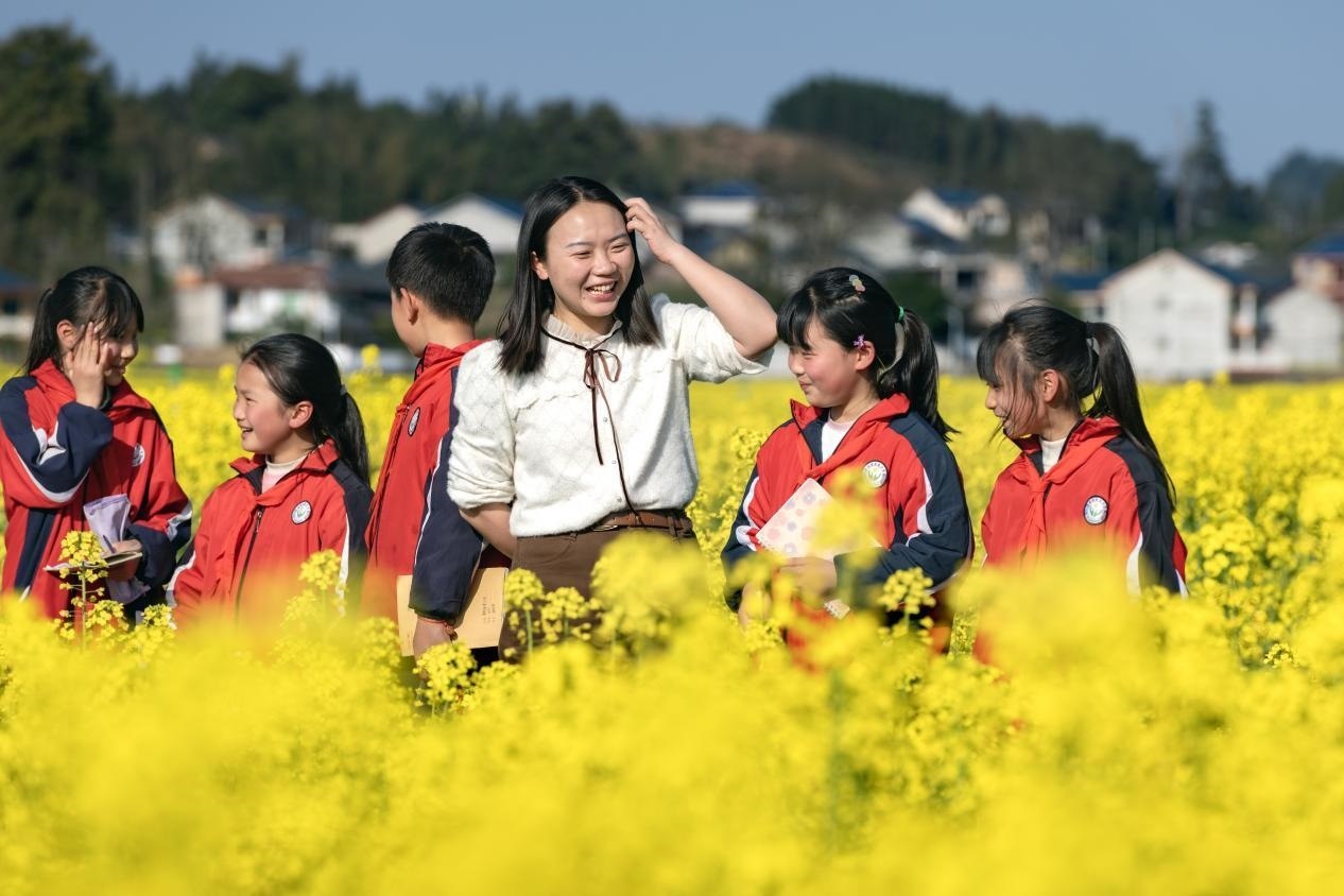 李柏霖不愿意讓孩子們覺得這樣的情緒是生活的全部。她把課堂搬到野外,在“搖搖花”開的時候帶孩子們?nèi)タ础皳u搖花”,油菜花開時去看油菜花?;ㄒ彩窃姡亦l(xiāng)也是詩——若非如此,老師為什么走了又回呢?