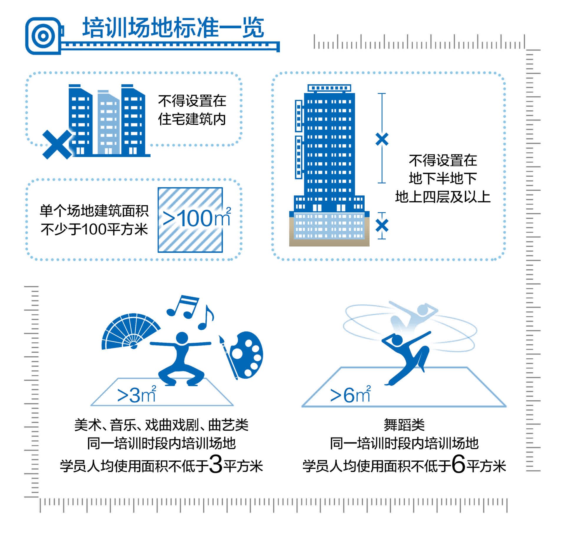 具體到店面內部硬件,《標準》明確,開展培訓教學的單個場地建筑面積應不少于100平方米,美術、音樂、戲曲戲劇、曲藝類同一培訓時段內培訓場地學員人均使用面積不低于3平方米,舞蹈類同一培訓時段內培訓場地學員人均使用面積不低于6平方米,確保不擁擠、易疏散。