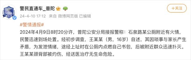16歲男子公廁內(nèi)點燃書包?警方通報:與家長產(chǎn)生矛盾 發(fā)泄情緒