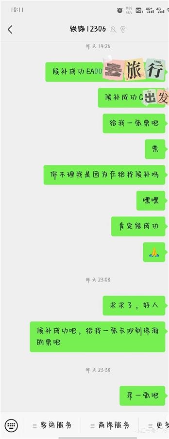 “你不理我是因?yàn)樵诮o我候補(bǔ)嗎”“親愛的我要票”……另一名網(wǎng)友也發(fā)帖稱,自己使用向12306微信公眾號“發(fā)瘋”的辦法,成功候補(bǔ)到了車票,其發(fā)布的網(wǎng)帖題為“適當(dāng)發(fā)瘋候補(bǔ)成功”。