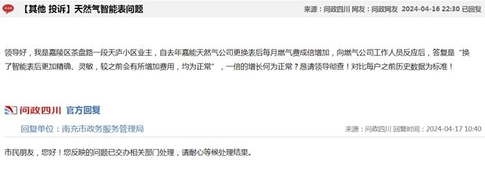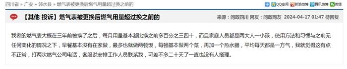 有居民在“問政四川”平臺稱,“自從換新燃氣表后,1年多了,家里人口沒變,做飯次數(shù)沒變,燃氣費每月從50多變成每月100多。”