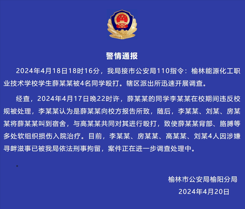 央視網(wǎng)消息:據(jù)陜西榆林公安消息,2024年4月18日18時16分,榆陽公安局接市公安局110指令:榆林能源化工職業(yè)技術(shù)學(xué)校學(xué)生薛某某被4名同學(xué)毆打。轄區(qū)派出所迅速開展調(diào)查。