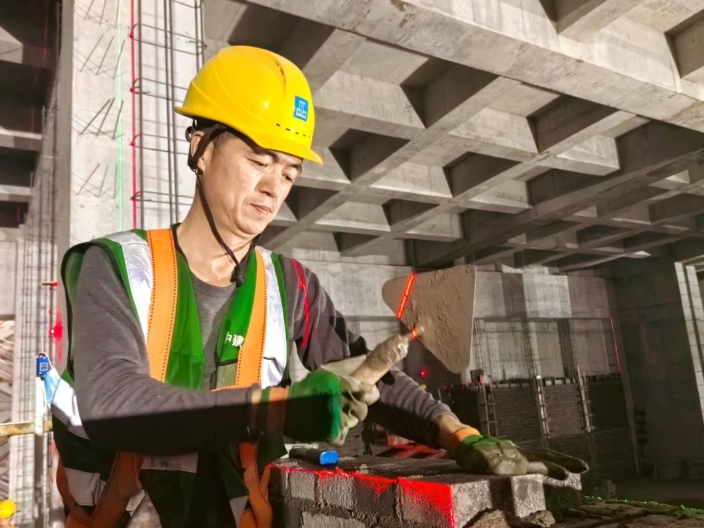 鏟灰、抹灰、砌磚、敲實(shí)……北京東南高速公路智慧物流港的工地上,中建三局北京公司的砌筑工紀(jì)慶生手握灰刀、上下翻飛,動作一氣呵成,面前的磚墻交錯排列、壘疊起來,已砌到十余米高。