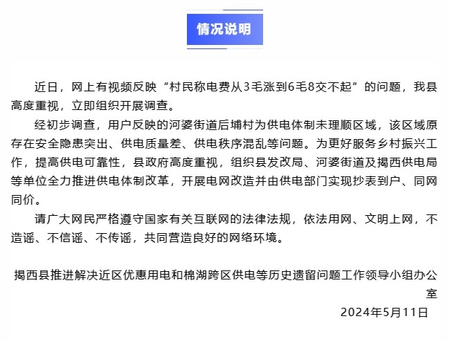 央視網(wǎng)消息:據(jù)“揭西發(fā)布”微信公眾號(hào)消息,廣東省揭陽市揭西縣推進(jìn)解決近區(qū)優(yōu)惠用電和棉湖跨區(qū)供電等歷史遺留問題工作領(lǐng)導(dǎo)小組辦公室5月11日發(fā)布通報(bào)稱,近日,網(wǎng)上有視頻反映“村民稱電費(fèi)從3毛漲到6毛8交不起”的問題,該縣立即組織開展調(diào)查。