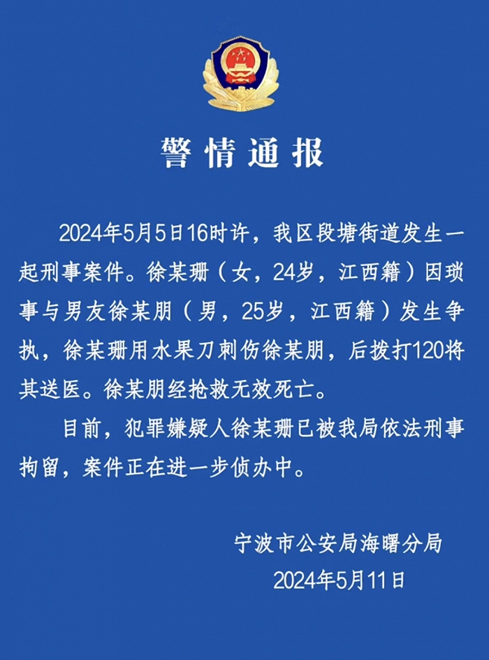 央視網(wǎng)消息:5月11日,寧波市公安局海曙分局發(fā)布警情通報,5月5日16時許,海曙區(qū)段塘街道發(fā)生一起刑事案件。徐某珊(女,24歲,江西籍)因瑣事與男友徐某朋(男,25歲,江西籍)發(fā)生爭執(zhí),徐某珊用水果刀刺傷徐某朋,后撥打120將其送醫(yī)。徐某朋經(jīng)搶救無效死亡。目前,犯罪嫌疑人徐某珊已被海曙分局依法刑事拘留,案件正在進一步偵辦中。