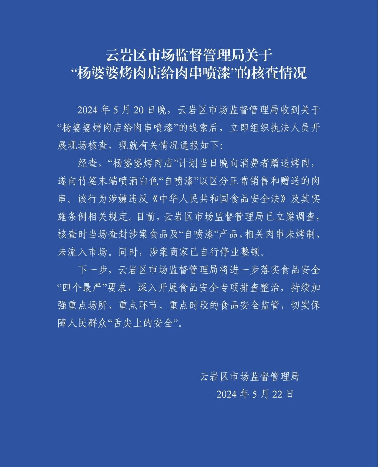 央視網(wǎng)消息:5月22日,貴陽市云巖區(qū)市場監(jiān)管局官方微信公眾號發(fā)布關(guān)于“楊婆婆烤肉店給肉串噴漆”的核查情況。經(jīng)查,“楊婆婆烤肉店”計劃當日晚向消費者贈送烤肉,遂向竹簽末端噴酒白色“自噴漆”以區(qū)分正常銷售和贈送的肉串。該行為涉嫌違反《中華人民共和國食品安全法》及其實施條例相關(guān)規(guī)定。目前,云巖區(qū)市場監(jiān)督管理局已立案調(diào)查,核查時當場查封涉案食品及“自噴漆”產(chǎn)品,相關(guān)肉串末烤制、未流入市場。同時,涉案商家已自行停業(yè)整頓。