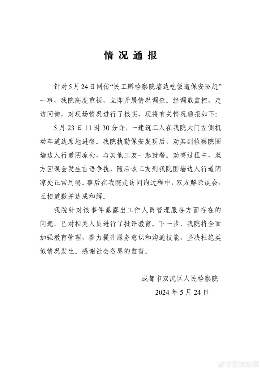 ·成都雙流檢察院回應(yīng)“民工蹲墻邊吃飯遭保安驅(qū)趕”:系誤會已和解。
