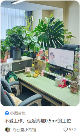 “按個(gè)人喜好裝修的工位可以讓年輕人在這一方小天地里可以獲得短暫的歸屬感與安全感,將目之所及之處都變成自己想要的樣子,令他們?cè)诳陀^條件有限的情況下盡可能讓自己感到舒適,也更容易從工作中感到幸福。”于光瑞分析說(shuō)。