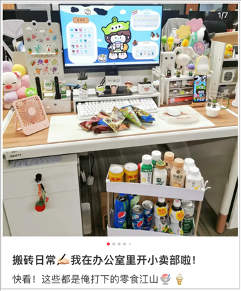 除此之外,還有人在工位養(yǎng)魚(yú)、寄居蟹、水母、蟑螂等寵物;有人在工位開(kāi)起了“小賣(mài)部”,吃的喝的樣樣俱全;有人環(huán)繞工位放上了靠墊、坐墊、抱枕、毛毯、沙發(fā)椅,保證隨時(shí)可以躺、靠、臥,主打一個(gè)舒適。