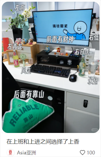 有網(wǎng)友分享工位的風(fēng)水大有講究:擺滿綠植象征欣欣向榮,整體布置左高右低;后背有靠,面不對(duì)門(mén);左靠窗,水杯放左邊,寓意風(fēng)生水起;雜物放桌面左邊,右邊越簡(jiǎn)約越好。