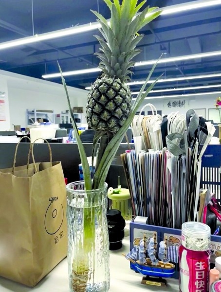 00后楊三日從事新媒體運(yùn)營(yíng)工作,她在工位上養(yǎng)了一個(gè)菠蘿,“養(yǎng)菠蘿是一件很酷的事情,不僅能觀賞,還能吃,很配我特立獨(dú)行的氣質(zhì)?!彼f(shuō)自從養(yǎng)了菠蘿之后,每天上班時(shí)心情就變得非常好?!拔业墓の痪拖駸釒в炅忠粯?,提前進(jìn)入了春天?!?/p>