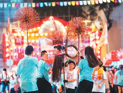 當(dāng)日20時(shí)30分許,“火龍”在點(diǎn)睛開光后,開始在大坑區(qū)內(nèi)游街。璀璨夜色下,數(shù)百名舞龍者左右騰挪,配合著傳統(tǒng)的步伐和姿勢把龍舞得千姿百態(tài)、流暢靈動;身著中國傳統(tǒng)服飾的小女孩,手持云燈和蓮花燈一同出發(fā),不時(shí)與觀眾互動,傳遞喜氣。