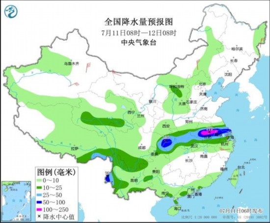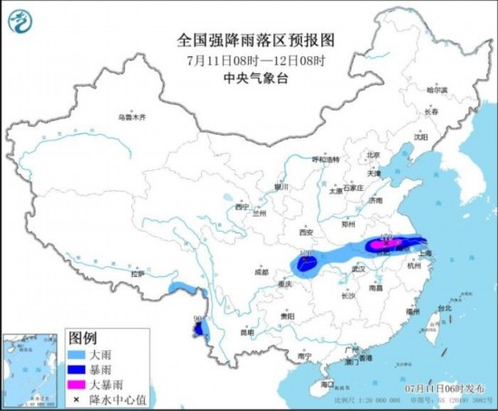 7月11日08時至12日08時,四川東北部、重慶中北部、湖北西部和北部、河南東南部、安徽中部、江蘇南部、上海以及西藏東南部、云南西部等地部分地區(qū)有大到暴雨,其中,安徽中部、江蘇西南部、重慶北部等地部分地區(qū)有大暴雨(100~170毫米)。內蒙古東南部和西北部、黑龍江東部、新疆東部、浙江中北部等地部分地區(qū)有4~6級風,其中,新疆東部部分地區(qū)有6~7級風。