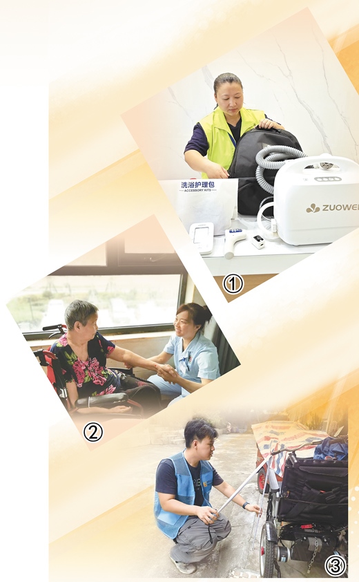 圖①:老年助浴員肖琳在店里收拾設(shè)備,準備上門為老人助浴。冷智梅攝 圖②:健康照護師劉馳在為耿守愛老人進行護理。本報記者 朱佩嫻攝 圖③:適老化改造評估師鐘晉軒在測量曾炳成老人的輪椅扶手高度。本報記者 洪秋婷攝