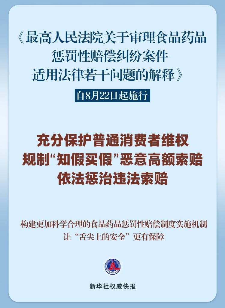 《最高人民法院關(guān)于審理食品藥品懲罰性賠償糾紛案件適用法律若干問(wèn)題的解釋》8月21日發(fā)布,自22日起施行。