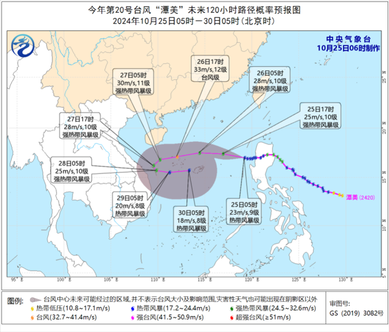 人民網(wǎng)北京10月25日電 (溫璐、高清揚(yáng))據(jù)中央氣象臺消息,昨日,受“潭美”和冷空氣共同影響,臺灣島西部和南部、福建沿海、浙江沿海、廣東中部沿海等地出現(xiàn)8~10級陣風(fēng),局地11~12級。臺灣島東部和北部出現(xiàn)暴雨或大暴雨,臺北市、基隆市和宜蘭縣局地特大暴雨。預(yù)計今年第20號臺風(fēng)“潭美”即將移入南海東部海面,強(qiáng)度緩慢增強(qiáng),最強(qiáng)可達(dá)強(qiáng)熱帶風(fēng)暴級或臺風(fēng)級(28-33米/秒,10-12級),10月27日夜間開始逐漸轉(zhuǎn)向偏東方向移動,強(qiáng)度逐漸減弱。