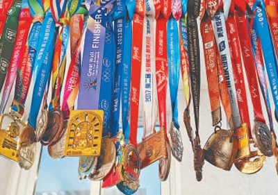 何亞君的馬拉松獎牌。 本報(bào)記者 易舒冉攝