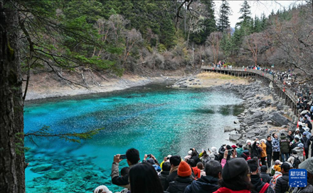 11月16日,游客在九寨溝景區(qū)五彩池觀光。