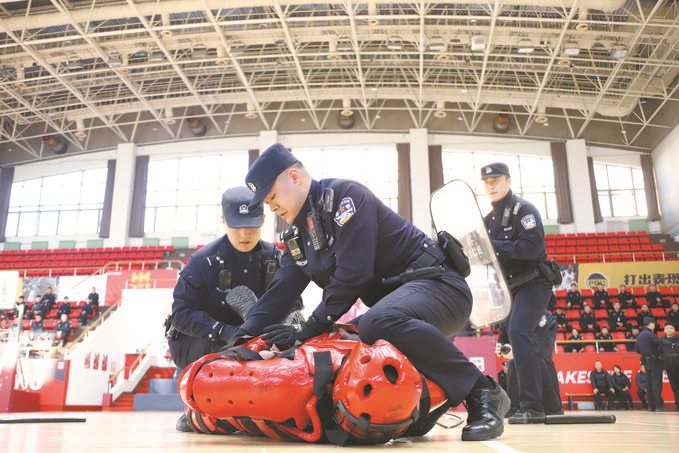 圖為民警輔警開展處置突發(fā)事件演練。本報(bào)記者 寇 松 攝