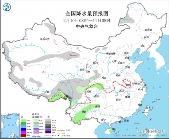 全國降水量預報圖(2月10日08時-11日08時) 圖片來源:中央氣象臺網站