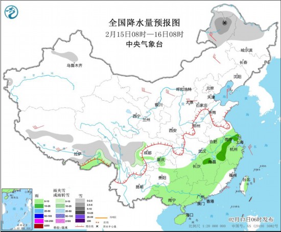 全國降水量預(yù)報圖(2月15日08時-16日08時) 圖片來源:中央氣象臺網(wǎng)站