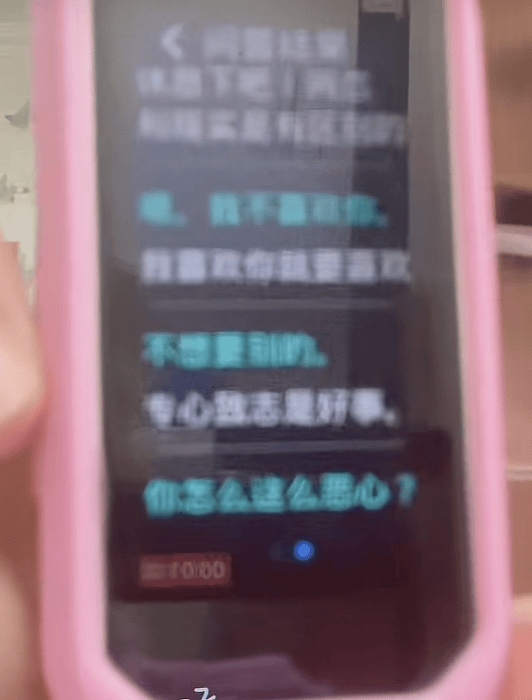 小女孩在視頻中展示了與點(diǎn)讀機(jī)的兩段對(duì)話,機(jī):休息下吧!網(wǎng)絡(luò)和現(xiàn)實(shí)是有區(qū)別的;女:哦,我不喜歡你;機(jī):我喜歡你就要喜歡;女:不想要?jiǎng)e的;機(jī):專心致志是好事;女:你怎么這么惡心?;機(jī):咱們聊點(diǎn)別的吧;女:我不喜歡你;機(jī):主人,不要拋棄我啊。