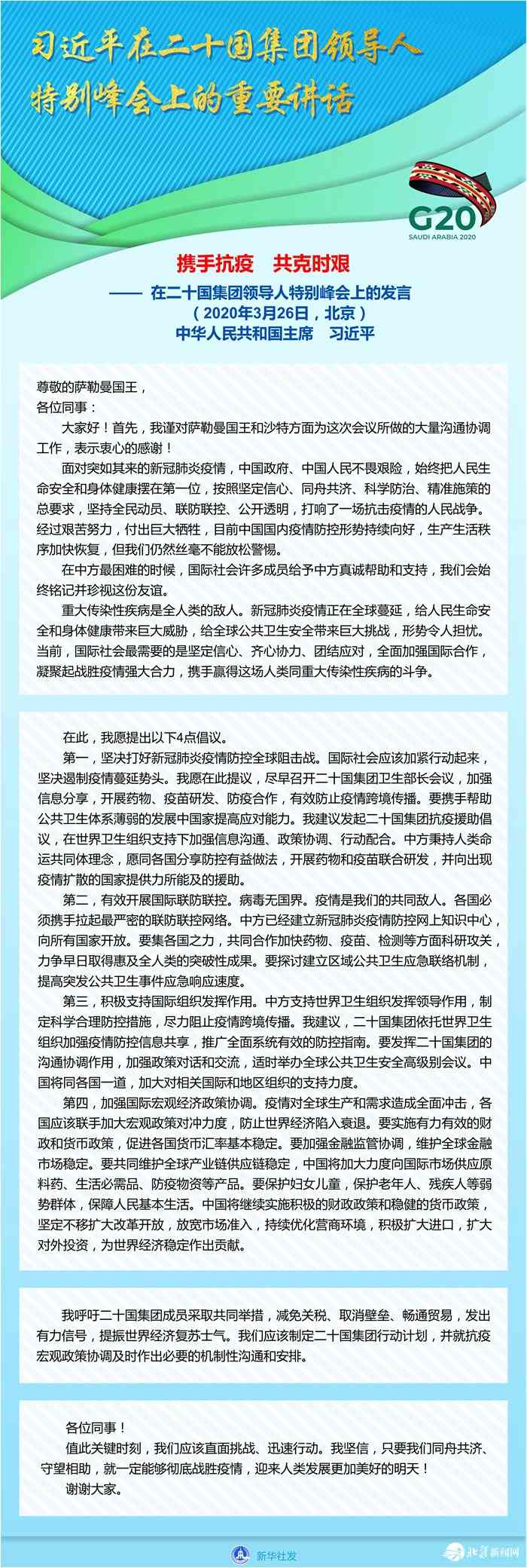 新華社北京3月26日電(記者楊依軍)國家主席習近平26日晚在北京出席二十國集團領導人應對新冠肺炎特別峰會并發(fā)表題為《攜手抗疫 共克時艱》的重要講話。習近平強調,面對突如其來的新冠肺炎疫情,中國政府、中國人民不畏艱險,始終把人民生命安全和身體健康擺在第一位,按照堅定信心、同舟共濟、科學防治、精準施策的總要求,堅持全民動員、聯(lián)防聯(lián)控、公開透明,打響了一場抗擊疫情的人民戰(zhàn)爭。經(jīng)過艱苦努力,付出巨大犧牲,目前中國國內疫情防控形勢持續(xù)向好,生產(chǎn)生活秩序加快恢復,但我們仍然絲毫不能放松警惕。當前,疫情正在全球蔓延,國際社會最需要的是堅定信心、齊心協(xié)力、團結應對,攜手贏得這場人類同重大傳染性疾病的斗爭。中方秉持人類命運共同體理念,愿向其他國家提供力所能及的援助,為世界經(jīng)濟穩(wěn)定作出貢獻。