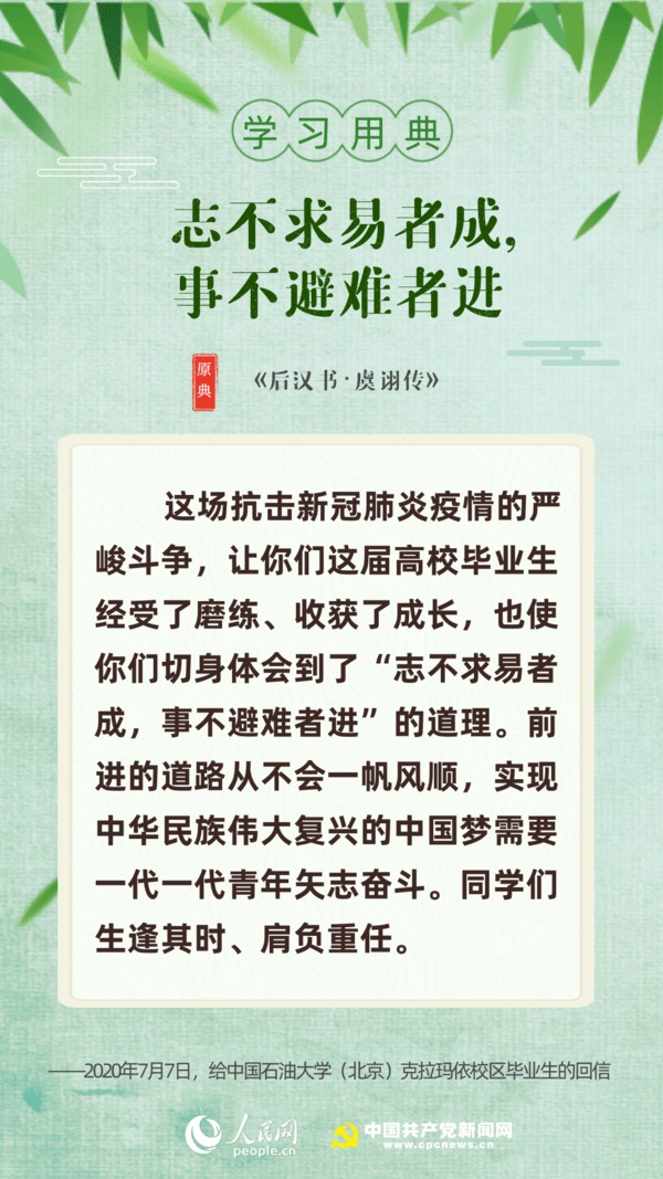 【編者按】“志不求易者成,事不避難者進。”近日,習近平總書記給中國石油大學(北京)克拉瑪依校區(qū)畢業(yè)生回信,對廣大高校畢業(yè)生提出殷切期望。“人生在勤,勤則不匱”“積土而為山,積水而為?!薄陙?,習近平多次引用詩句典故,激勵包含廣大青年在內的全黨全國各族人民拼搏奮進、埋頭苦干。正值“戰(zhàn)疫”“戰(zhàn)貧”關鍵時刻,人民網(wǎng)·中國共產(chǎn)黨新聞網(wǎng)與您一起回顧習近平講話中關于“奮斗”的10個名句。