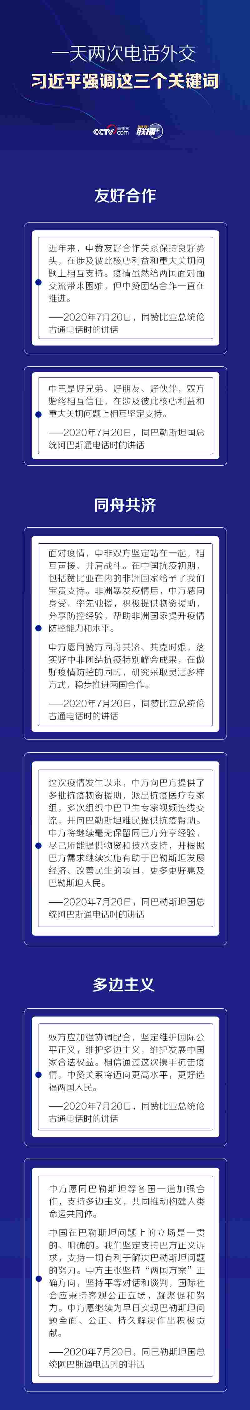7月20日晚,習(xí)近平主席分別同贊比亞總統(tǒng)倫古和巴勒斯坦國總統(tǒng)阿巴斯通電話。通話中,習(xí)近平主席肯定了與兩國的相互信任和支持,主張同舟共濟(jì)、共克時艱,強調(diào)堅定維護(hù)國際公平正義,維護(hù)多邊主義。