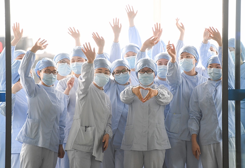 2020年3月23日,武漢市第一醫(yī)院部分醫(yī)護(hù)人員在武漢天河機(jī)場為廣東第14批援鄂醫(yī)療隊(duì)送行