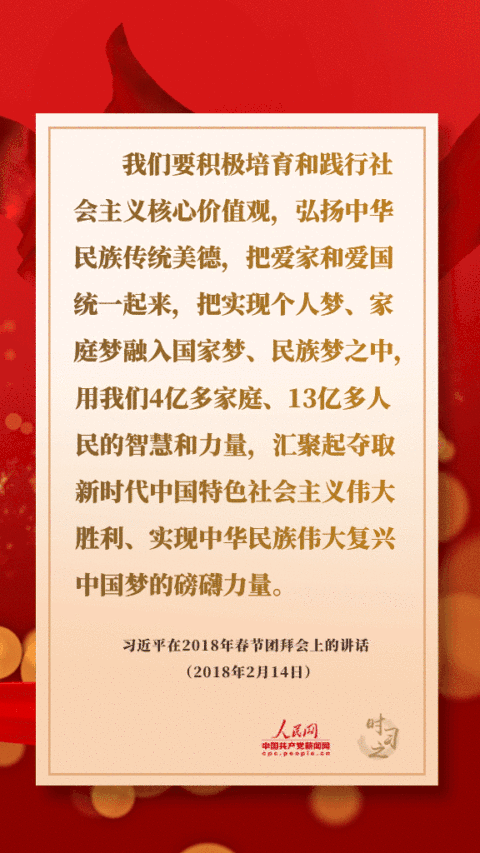 我們要積極培育和踐行社會(huì)主義核心價(jià)值觀,弘揚(yáng)中華民族傳統(tǒng)美德,把愛家和愛國統(tǒng)一起來,把實(shí)現(xiàn)個(gè)人夢、家庭夢融入國家夢、民族夢之中,用我們4億多家庭、13億多人民的智慧和力量,匯聚起奪取新時(shí)代中國特色社會(huì)主義偉大勝利、實(shí)現(xiàn)中華民族偉大復(fù)興中國夢的磅礴力量。