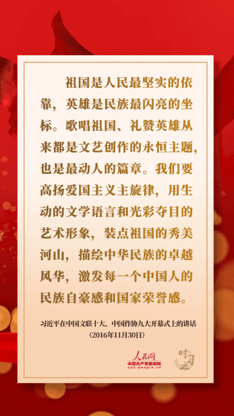 祖國是人民最堅(jiān)實(shí)的依靠,英雄是民族最閃亮的坐標(biāo)。歌唱祖國、禮贊英雄從來都是文藝創(chuàng)作的永恒主題,也是最動(dòng)人的篇章。我們要高揚(yáng)愛國主義主旋律,用生動(dòng)的文學(xué)語言和光彩奪目的藝術(shù)形象,裝點(diǎn)祖國的秀美河山,描繪中華民族的卓越風(fēng)華,激發(fā)每一個(gè)中國人的民族自豪感和國家榮譽(yù)感。